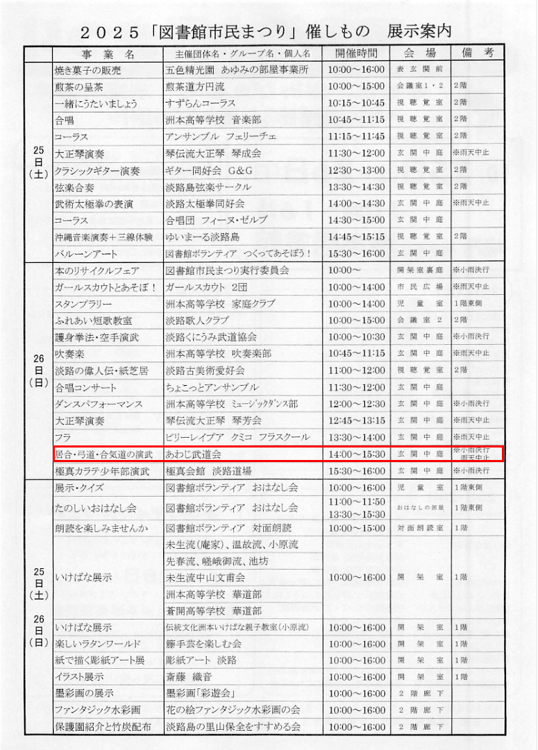 2025年10月19日(日)松帆活性化センターの稽古は洲本市文化体育館に振替になります。